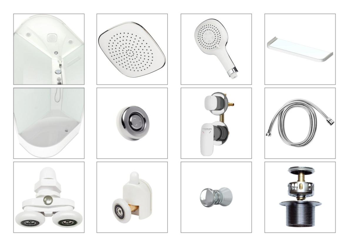 Гарантийный срок на комплектующие (уплотнители,ролики дверей,хромированное и лакокрасочное покрытие,фурнитура,сифон): 1 год.