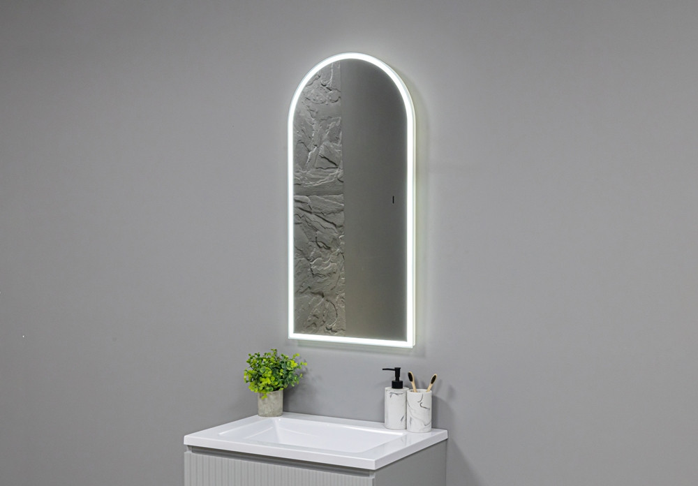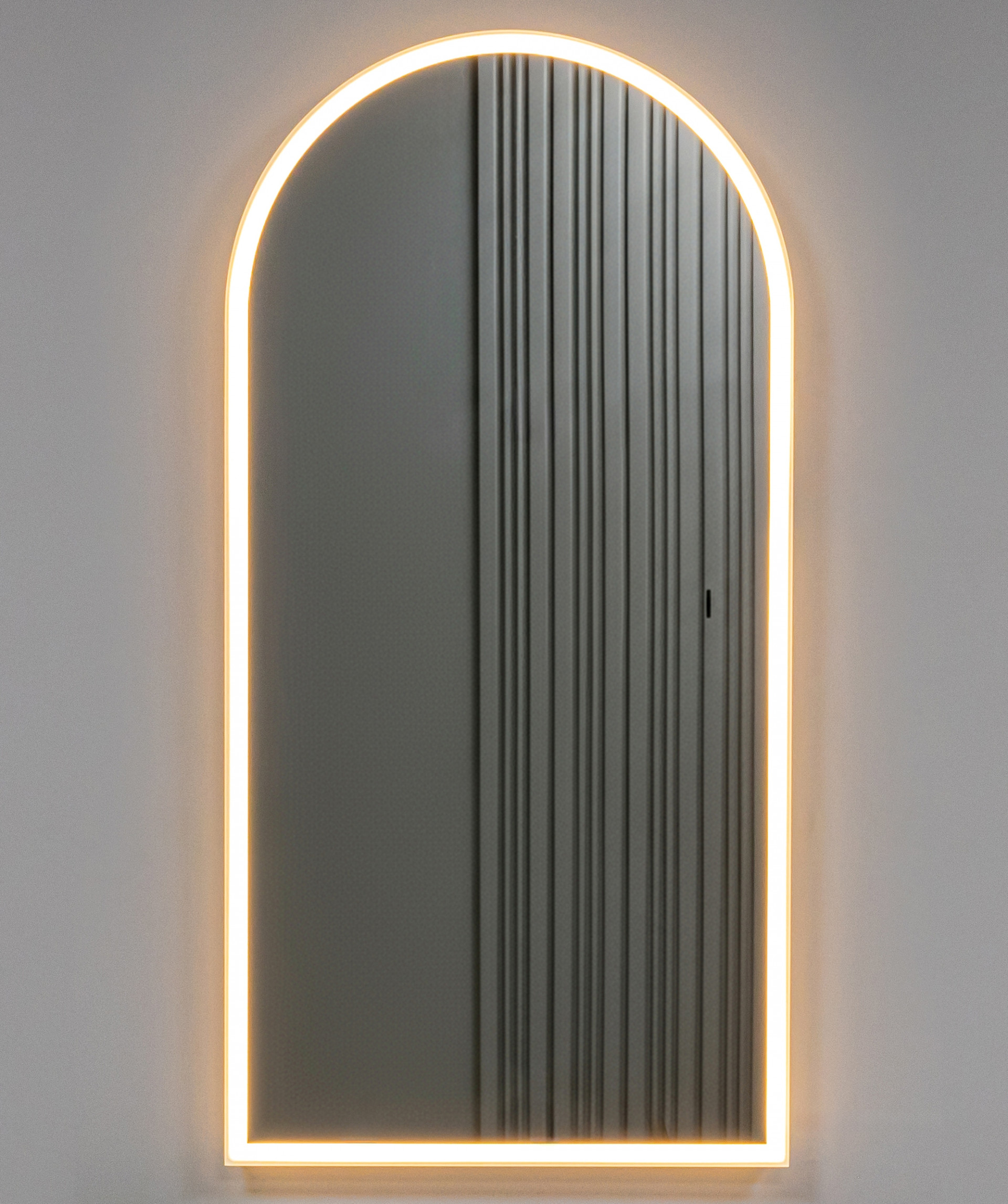 Зеркало арочной формы с LED-подсветкой обладает прекрасными архитектурными свойствами. Модель с приятной фронтальной подсветкой и регулируемым сенсорным выключателем с функцией диммера, выглядит легко и невесомо. Такое зеркало добавит пространству воздуха и света, в горизонтальном положении расширит его. В вертикальном — добавит помещению высоты, станет отличным решением для прихожей и небольшой ванной комнаты с узкой раковиной или несколькими раковинами. Дизайн зеркала и опция смены температуры света, позволяющая выбрать один из 3-х режимов свечения (тёплый, нейтральный, холодный), помогут сделать интерьер уютным и живым, добавить ему обаятельных ноток несовершенства.
