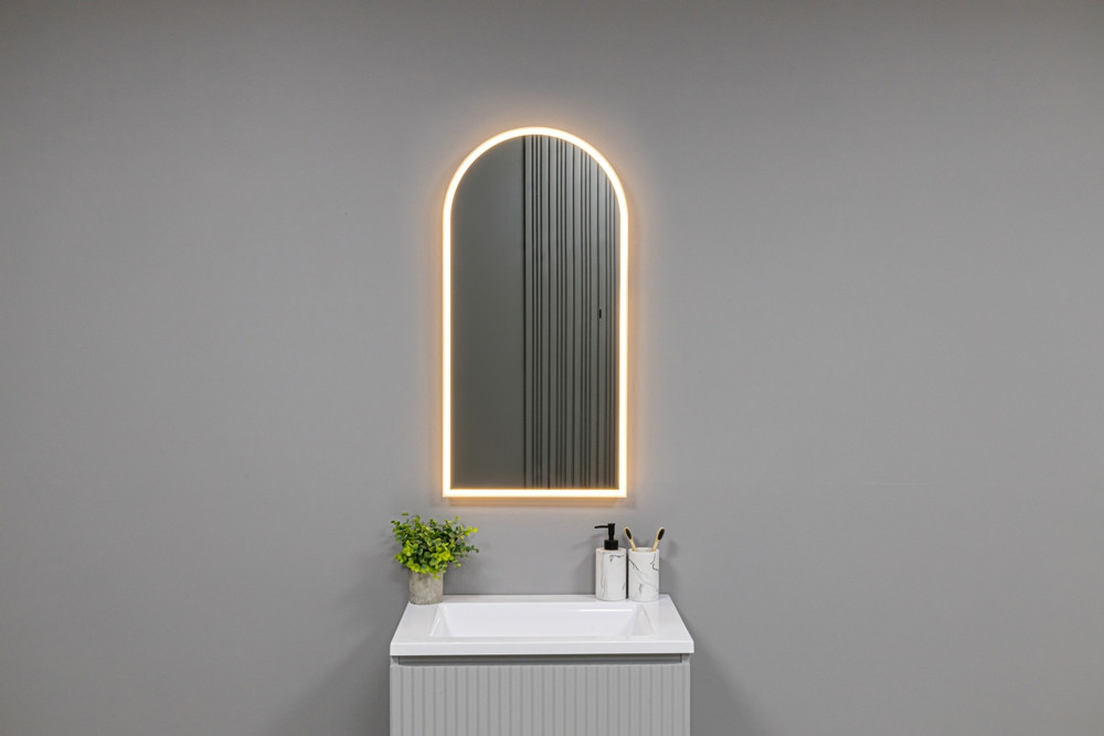 Зеркало арочной формы с LED-подсветкой обладает прекрасными архитектурными свойствами. Модель с приятной фронтальной подсветкой и регулируемым сенсорным выключателем с функцией диммера, выглядит легко и невесомо. Такое зеркало добавит пространству воздуха и света, в горизонтальном положении расширит его. В вертикальном — добавит помещению высоты, станет отличным решением для прихожей и небольшой ванной комнаты с узкой раковиной или несколькими раковинами. Дизайн зеркала и опция смены температуры света, позволяющая выбрать один из 3-х режимов свечения (тёплый, нейтральный, холодный), помогут сделать интерьер уютным и живым, добавить ему обаятельных ноток несовершенства.